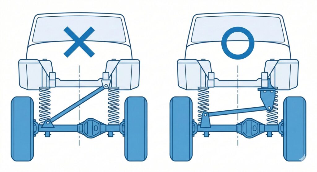 - コイルスプリング車: コイルの自由長が伸びることで、車軸を支えるコントロールアームの角度が純正状態から大きく変わってしまう。