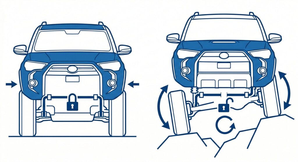 例えば、ランドクルーザー70系などのリーフ車において、2インチ以上アップしたサスペンションでスタビライザーを外してしまうと、操舵応答性に明らかな難が生じます。